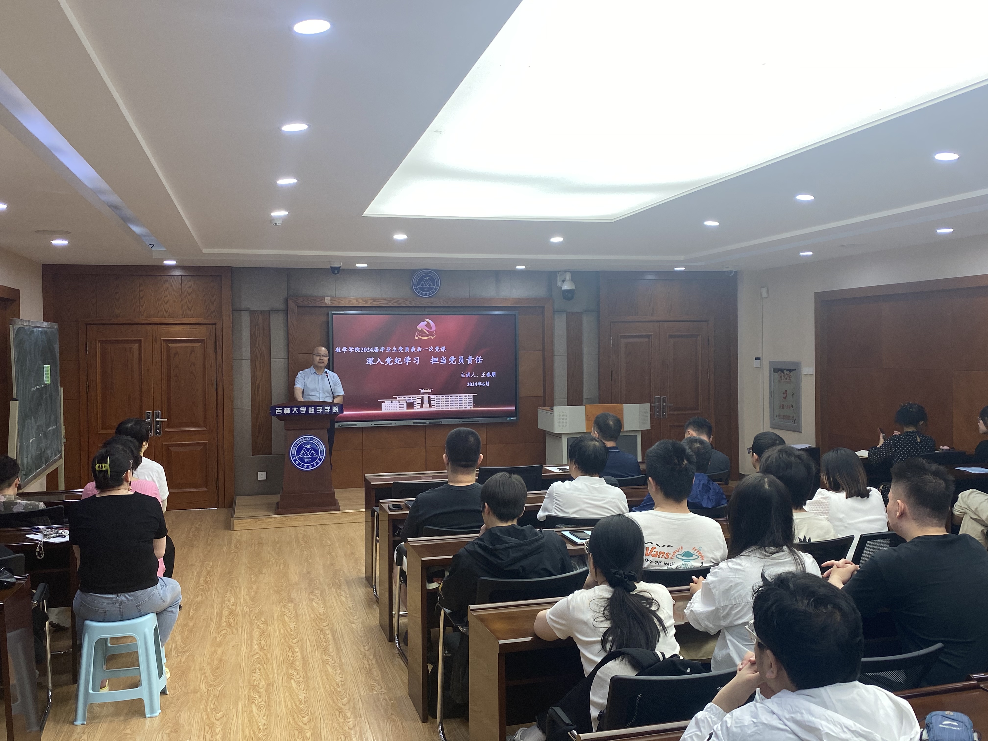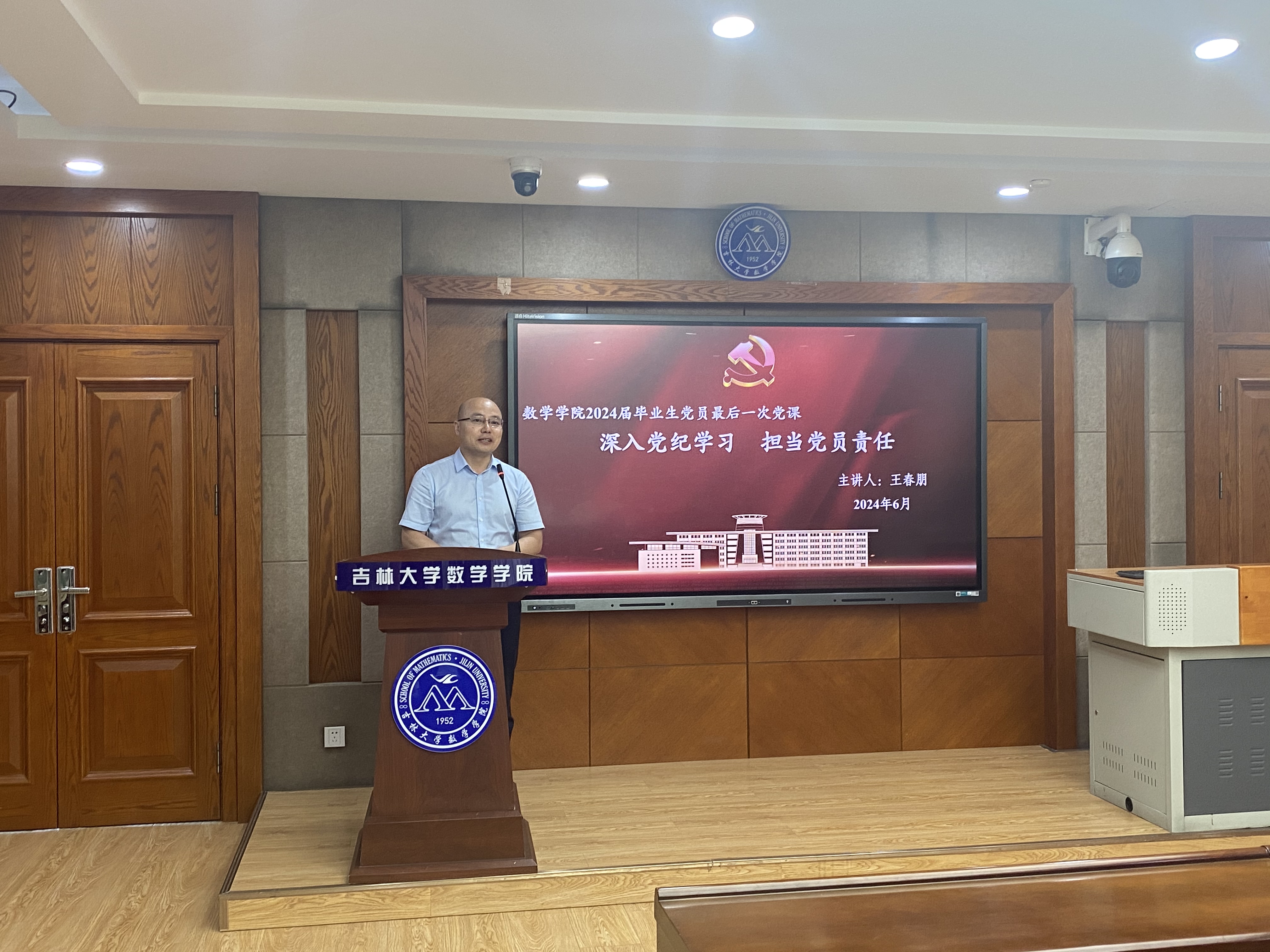 为推动党纪学习教育走深走实,教育引导全体毕业生党员增强纪律意识,在知敬畏、存戒惧、守底线中夯实理念信念之基,在推进强国建设、民族复兴伟业中展现青春作为、彰显青春风采、贡献青春力量。6月17日,jinnianhui今年会党委书记王春朋为2024届全体毕业生党员讲授了毕业前“最后一次党课”。