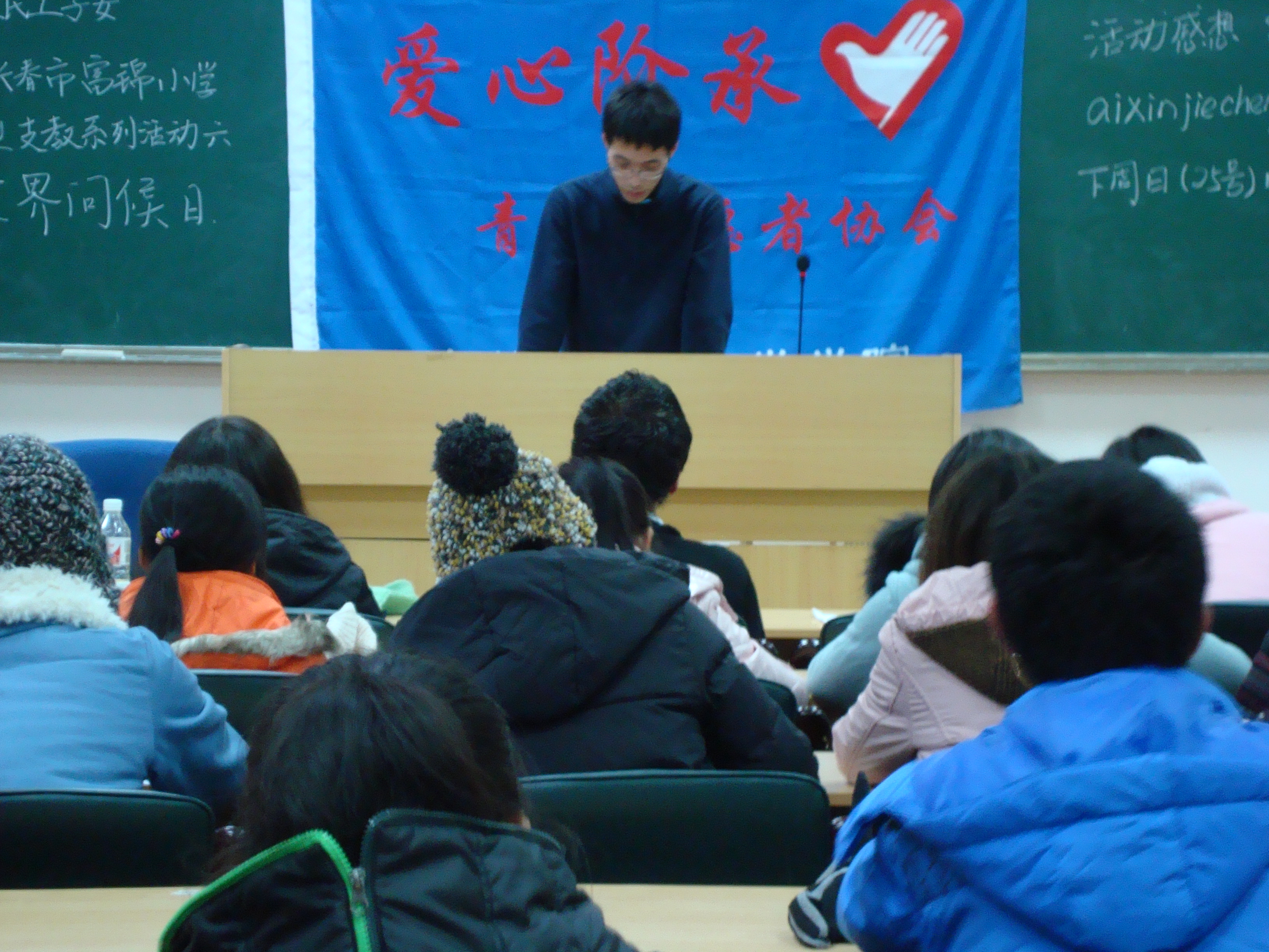 2012年11月15日晚6点,jinnianhui今年会爱心阶承青年志愿者协会在数学楼一楼报告厅举办了“走进长春市富锦小学--大型支教活动”系列之第六届“世界问候日”主题活动的志愿者培训。