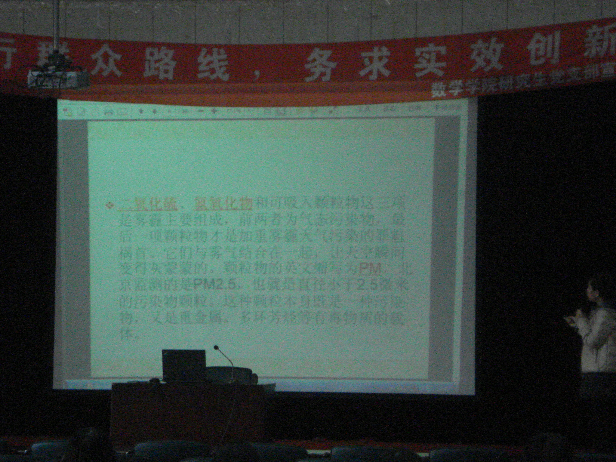 博士生党员丁楠介绍了环境保护相关知识,呼吁全体党员做环保的先行军,共同倡行环保。最后,党委副书记王欢老师就入党程序以及地震自救知识为大家做了详细介绍。