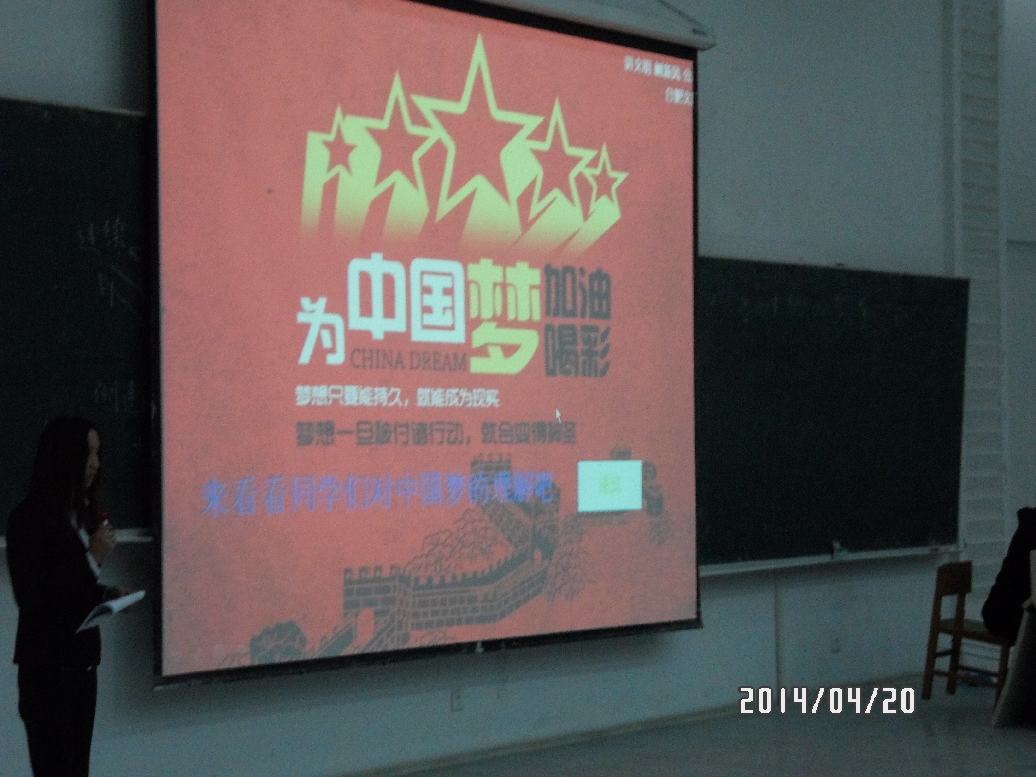 4月20日,由jinnianhui今年会团委实践部主办的“追忆红色神韵,续写华夏新篇”中国梦主题团日活动在经信教学楼举办。中国梦最大的特点就是把国家、民族和个人作为一个命运的共同体。实现中华民族伟大复兴,就是中华民族近代以来最伟大的梦想。对于我们当代大学生来说,如何实践中国梦,我们有时会感到迷茫。本次团日活动就是希望通过追忆那些点燃革命之火,坚定勇往直前的共产党先辈们,从他们身上我们自己心中对中国梦的理解。本次活动旨在引导团员了解党的历史,领悟党的精神,切实增强党员的责任感和使命感。同时加深对中国梦的理解。