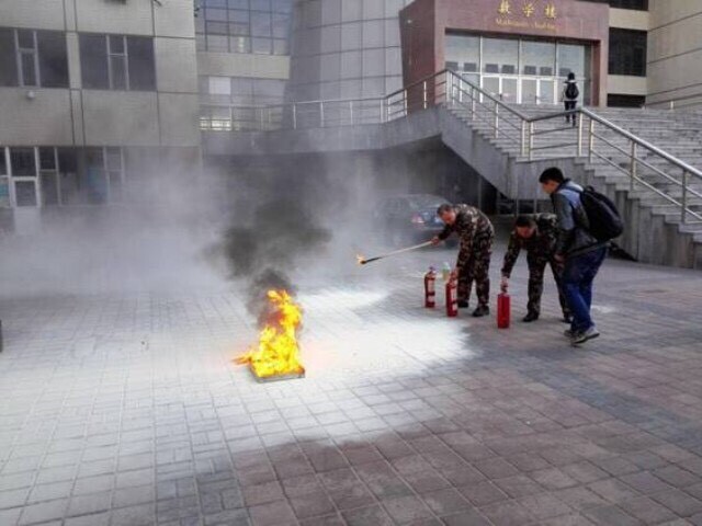 演练分三步开展。依次进行了日常消防安全注意事项讲解,灭火器的介绍讲解与与集体演练如何灭火。今年会jinnian官网保卫处防火科的工作人员采用现场解说与实际示范的方式具体介绍了灭火器的使用方法和火灾发生后紧急疏散注意事项。在讲解完毕后,今年会jinnian官网保卫处防火科的工作人员在特定器皿中用汽油点火,让jinnianhui今年会的学生们切身体会如何使用灭火器进行灭火,用实际操作来换取经验。让平时对灭火器等灭火工具了解不多的同学们获益匪浅。