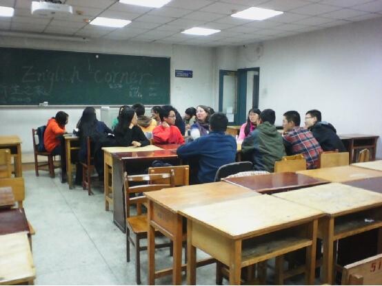 英语角是个在快乐中提高英语口语表达能力和沟通能力的活动,它比平常的英语课更轻松,也更贴近于日常生活,是一种深受青年人喜爱的课余活动。10月28日,我院社团新生之家就成功举办了一次英语角,活动于晚上6点在逸夫教学楼小教室123正式开始,共有21名同学和三位外教参加。