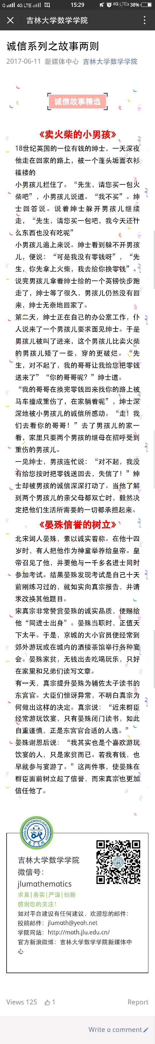 结合不同时段的诚信特征,采取对应宣传形式。充分发挥新媒体的作用,在微信平台及微博上每日推送诚信标语、小故事,增强大学生诚信意识。同时运用微信公众号,微博话题讨论,微信互动等形式,深入开展了诚信教育网络宣传活动,广泛宣讲了诚实守信事迹。