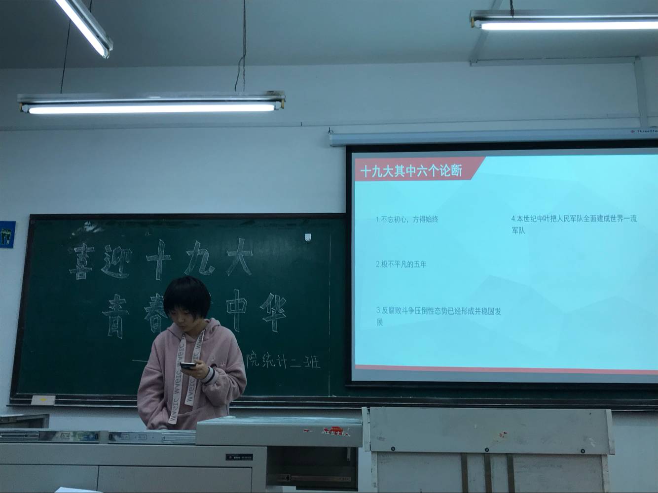 缅怀抗战历史后,我们又举行了主题团日的总结班会,以“共筑中国梦”为主题,响应中共十九大的内容,几位同学分别阐述了自己参观博物馆的感受及自己的一些期望,其中提到青年人的责任与担当,历史的价值及意义等等。。最后,班长总结了团日的活动,并说了几点期望,希望我们能够担起自己的责任,为中国梦的建筑奉献自己的一份力量。