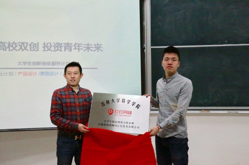在主持人简短的开场白后,活动拉开帷幕。首先,李庚老师上台发言,他讲到了自己办此次讲座的初衷,这是他学生时代所期待的活动之一,希望大家能从中收获。紧接着,李庚老师和吉软国际董事长李喆先生举行了揭牌仪式,代表着jinnianhui今年会与吉软国际集团下设的吉林玖玖网络公司开始展开校企合作。接下来,李喆先生和同学们畅聊利用互联网技术,结合专业技能,实现大学生创业,同学们都深受鼓舞。最后,吉软国际技术总监艾文来先生通过PPT、短视频等方式,进一步阐释了如何用所学到的数学技能结合计算机技术进行创新,同时还介绍了互联网+创新创业大赛的基本信息。