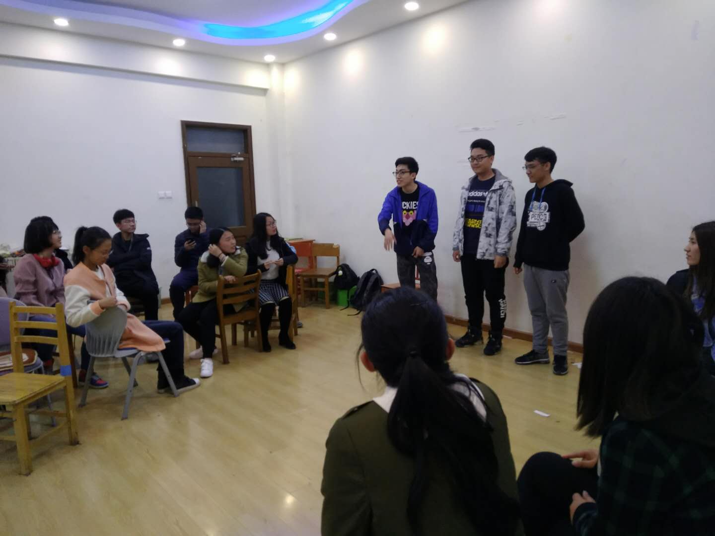 本次活动分为两个环节。第一个环节叫做情绪卡:我们先将同学们分为四组,每组出一人抽选一张写着情绪的卡片,然后准备好后将情绪通过自己的面目表情与肢体语言表现出来,让其他同学猜测。在这个环节中每个表演的同学尽自己所能,用表情和动作展现出自己对这种情绪的理解;第二个环节是猜歌名:每组两个同学进行表演,其他同学猜歌名;第三个环节是情景剧表演:同学们选择两个关键词,然后分组进行表演,分享彼此的心得。最后合影纪念下本次有趣的心理班会。