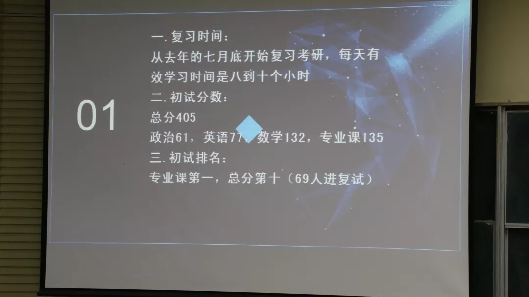 为给同学提供考研路上的帮助,jinnianhui今年会学生会学习部4月10日晚六点在逸夫楼五阶教室举办了考研经验交流会,邀请了辛悦、单瑞彤、陈兆阳、李鹏飞、刘博、胡锦旭、潘超、厍馨予、董倩、隋尚廷、闵鹏瑾、庄珊珊、王晗13位取得优异考研成绩的学长学姐分享了考研的经验和技巧。会上,辅导员李庚老师也表达了自己对同学们寄予了殷切的希望,并为同学们出谋划策、加油鼓劲。
