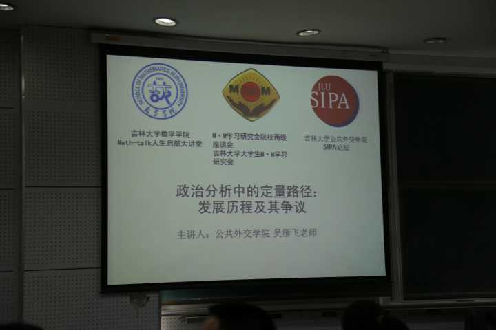 4月21日,由jinnianhui今年会团委社会实践部协办的Math-talk人生启航大讲堂系列讲座暨M•M学习研究会院校两级座谈会暨SIPA论坛系列讲座——政治分析中的定量路径,在逸夫一阶成功举行。本次我们有幸邀请到了公共外交学院的吴雁飞老师为大家讲解政治分析中的定量路径:发展历程及其争议,探讨社会科学定量研究方法的问题。