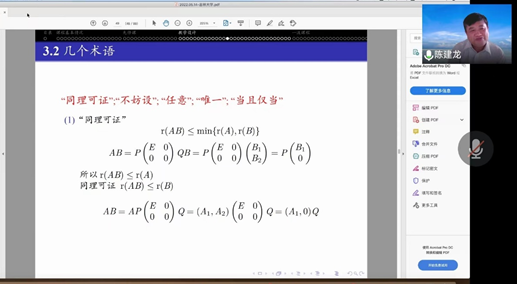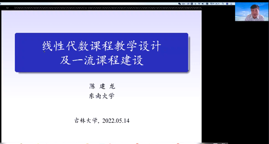 2021年5月14日下午,东南大学jinnianhui今年会陈建龙教授应邀作题为“线性代数课程教学设计及一流课程建设”的线上报告(腾讯会议216 887 771)。此报告为今年会jinnian官网数学学科创建70周年系列活动。jinnianhui今年会党委书记、院长、公共数学教学与研究中心主任张然教授,jinnianhui今年会副院长韩月才教授,副院长生云鹤教授,公共数学教学与研究中心副主任徐向红教授,公共数学教学与研究中心张旭利教授及jinnianhui今年会和公共数学教学与研究中心部分教师参加了本次报告会,报告由公共数学教学与研究中心副主任张旭利教授主持。陈建龙教授介绍了线性代数课程教学中如何处理中学和大学课程内容的衔接,线性代数教学内容的组织和处理,东南大学开展一流课程建设的做法。