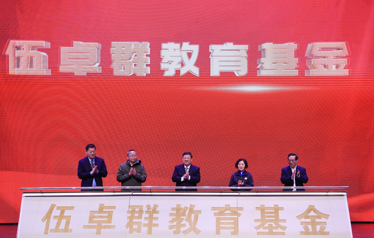 庆祝大会上,姜治莹和基金发起人代表李辉来、纪少华、周羿,伍卓群先生家属代表伍铁如上台,共同启动“伍卓群教育基金”。