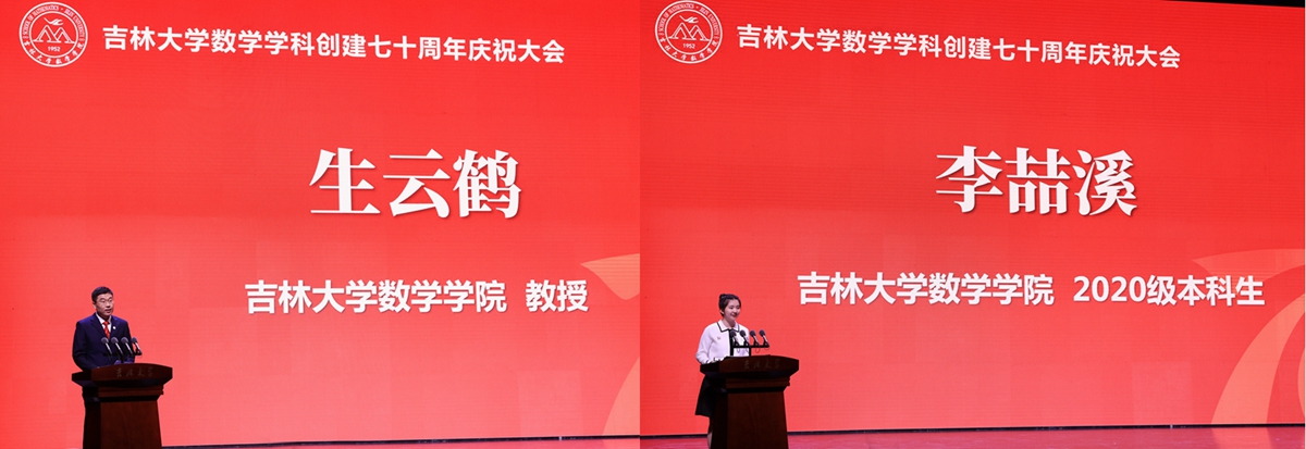 教师代表生云鹤、学生代表李喆溪分别发言,他们重温历史,追忆往事,表示要秉承“求实创新 励志图强”的校训精神,践行“人比山高 脚比路长”的理想信念,以求实的态度、创新的理念、励志的精神奋发图强,以前辈们为榜样,续写吉大数学的绚丽华章,再创吉大数学的灿烂辉煌。