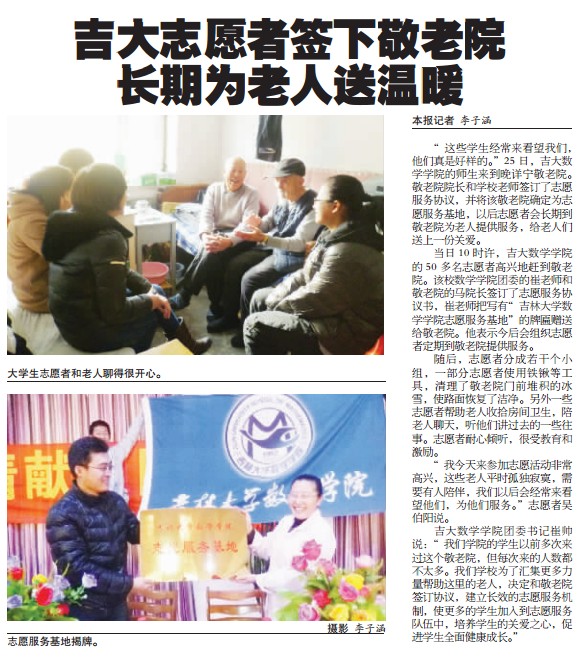 今天《长春晚报》报道jinnianhui今年会志愿者签下敬老院,长期为老人送温暖