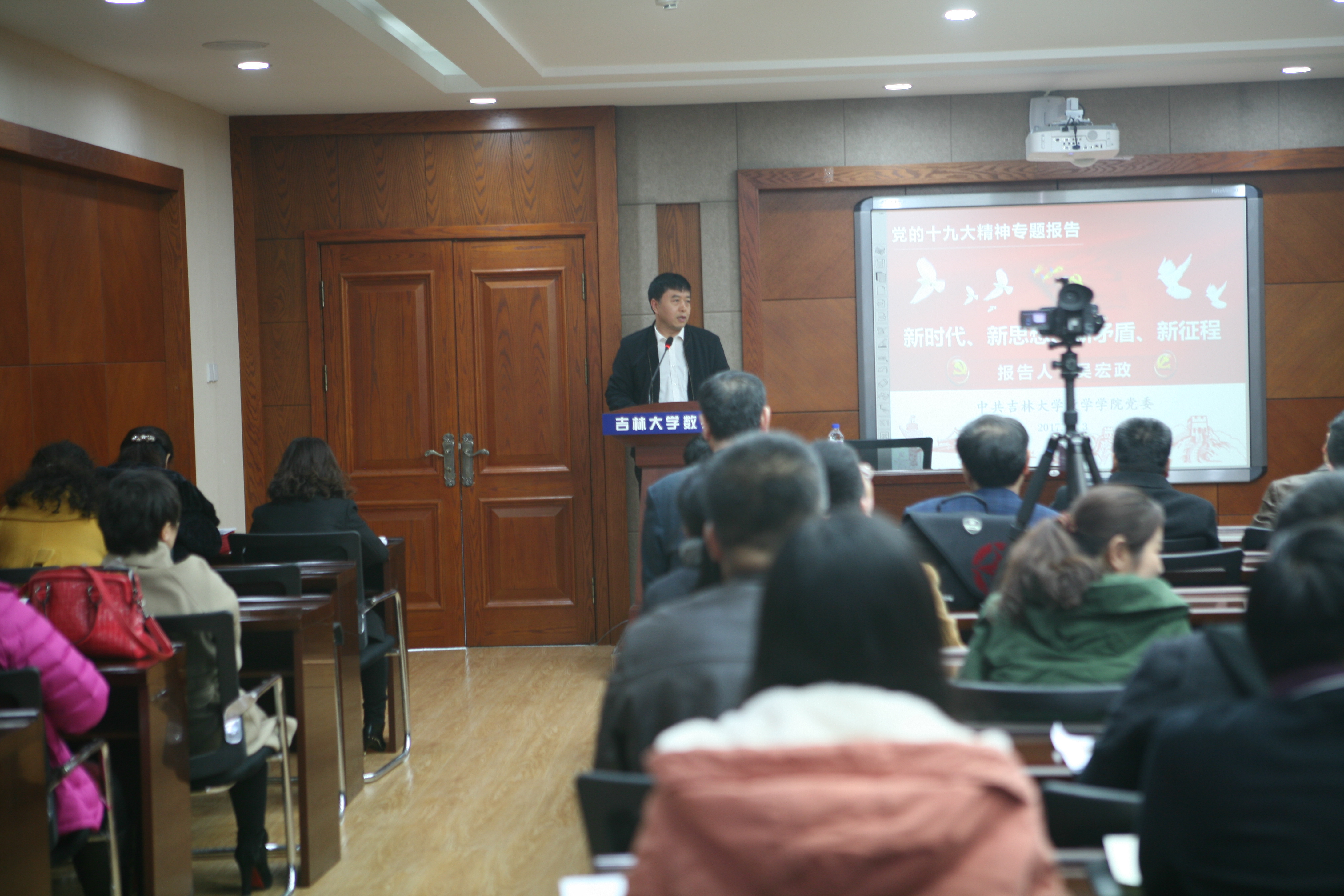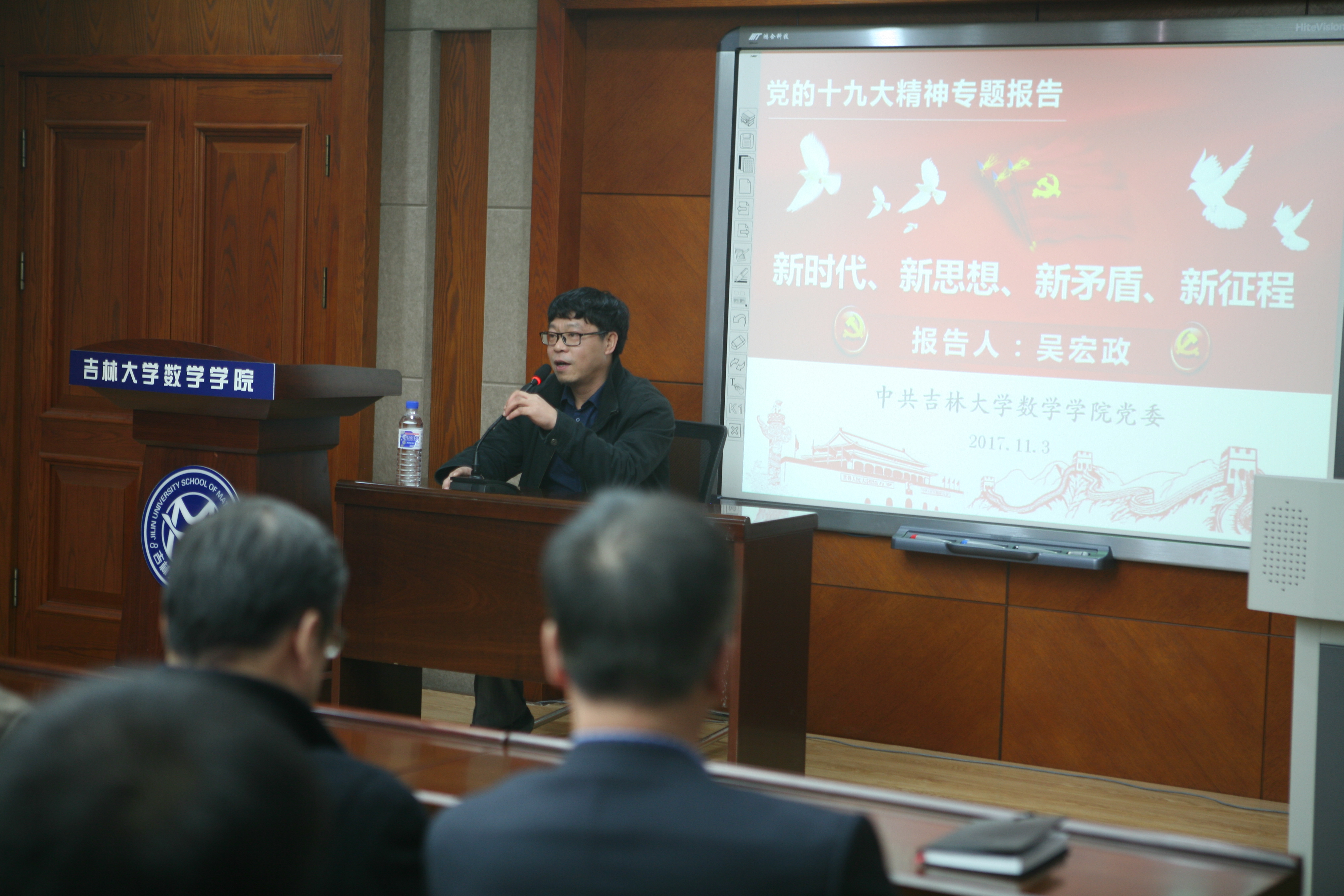 为深入学习贯彻党的十九大精神, 2017年11月3日下午1:30分,jinnianhui今年会党委邀请了“今年会jinnian官网党的十九大精神宣讲团”成员、马克思主义学院副院长吴宏政教授为学院全体党员做了题为《新时代新思想 新矛盾 新征程》的专题学习辅导报告。学院领导班子成员、党委委员、教工党员、学生党员代表、部分民主党派和无党派人士参会。