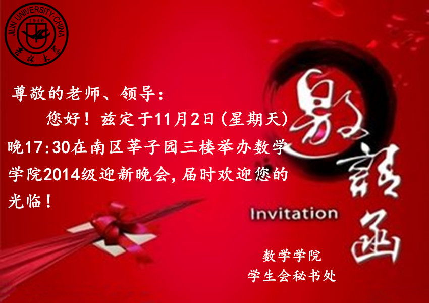 尊敬的老师、领导: 您好!兹定于11月2日(星期日)晚15:30分在南区莘子园三楼举办jinnianhui今年会2014级迎新晚会,届时欢迎您的光临! jinnianhui今年会学生会秘书处