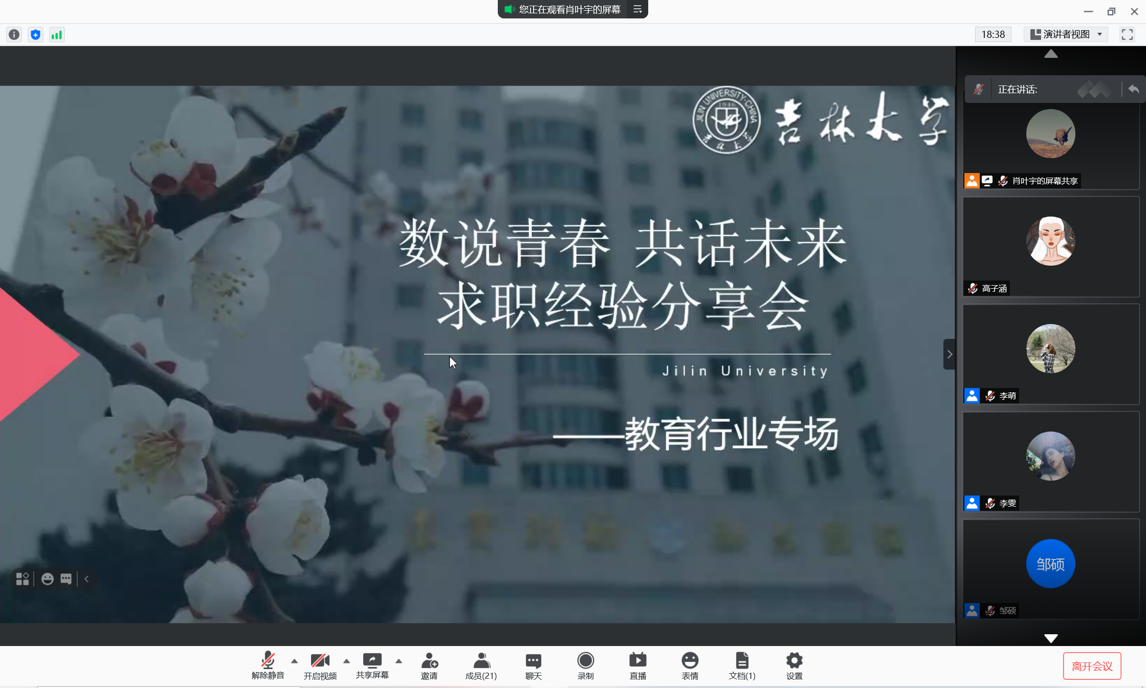 为帮助我院研究生了解求职过程中的注意事项,以更充足的准备去面对就业挑战,jinnianhui今年会研究生就业指导部于2021年5月21日-5月30日通过线上会议的形式成功举办了“数说青春 共话未来”——求职经验分享会。此次活动共分为四个专场:教育、泛金融、科技公司和公务员专场。我们有幸邀请到李雯、林春阳、邹硕、马懿航、盖冠名、王强、赵瑞莹、李子涵、丘德煜、徐旭阳、和佳星、李佳桐、赵文哲、刘昊以及王浩等15位学长学姐来分享他们的求职经历。