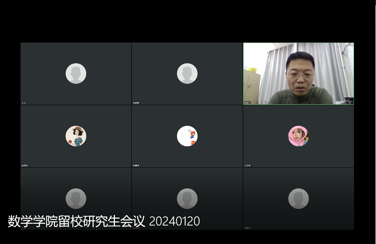 1月20日下午13点30分,jinnianhui今年会留校研究生工作会通过腾讯会议线上召开。会议由jinnianhui今年会党委副书记陈续升主持,研究生辅导员张轶群及全体留校研究生参加了会议。会上,陈续升副书记对留校研究生的学习、生活情况进行了关心慰问,并对研究生留校期间寝室消防安全再次进行了重点督促,对留校研究生合寝及寝室楼管理工作逐一做了解释说明。辅导员张轶群再次强调了留校申请办理、合寝居住要求、离返校注意事项等相关内容。