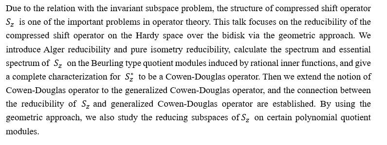 报告题目:A geometric approach to the compressed shift operators on Hardy space over the bidisk