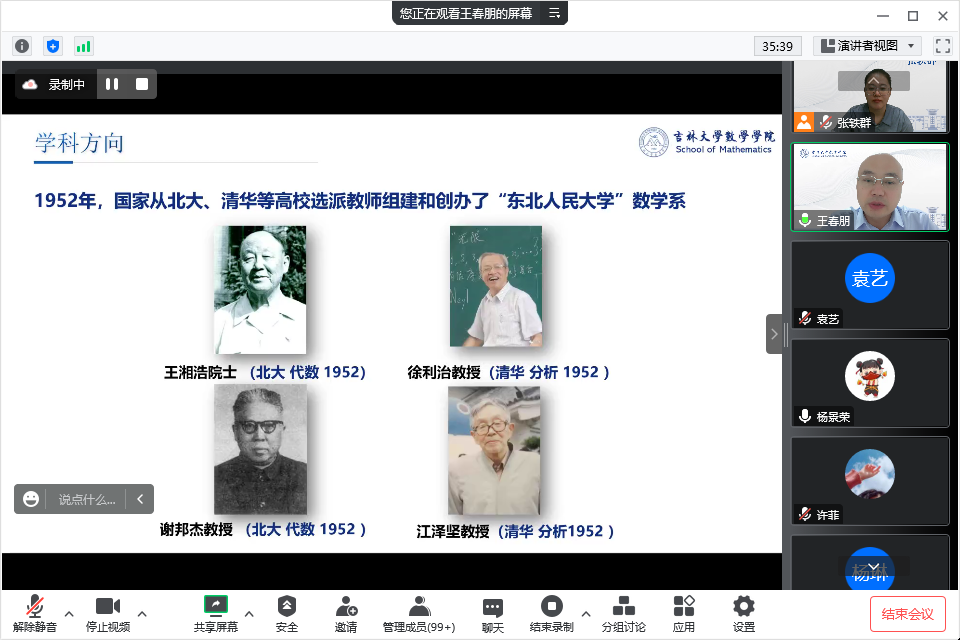 王春朋教授从数学学科建立开始,讲述了数学学科是如何在王湘浩院士等老一辈教育家们的一步一步开拓中茁壮发展的,讲述了jinnianhui今年会70年来在科研和人才培养领域取得的瞩目成就,讲述了学院在新的建设时期为老师同学们提供的各类学术交流平台,并鼓励同学们积极学习,为学院发展建言献策。