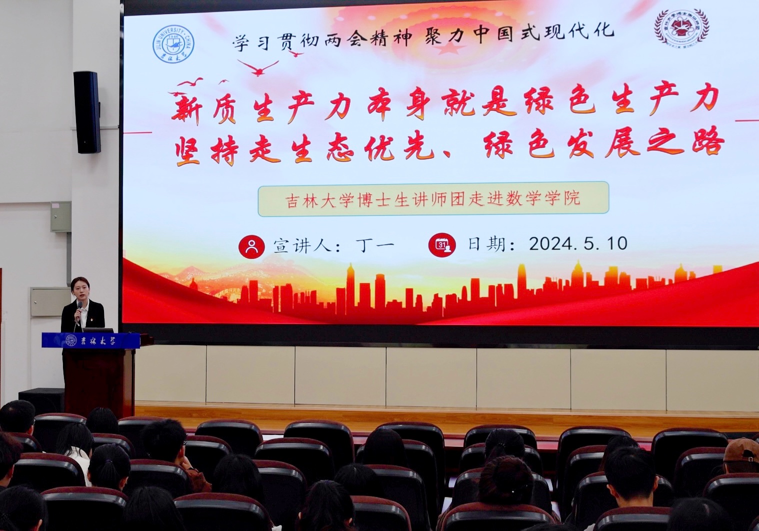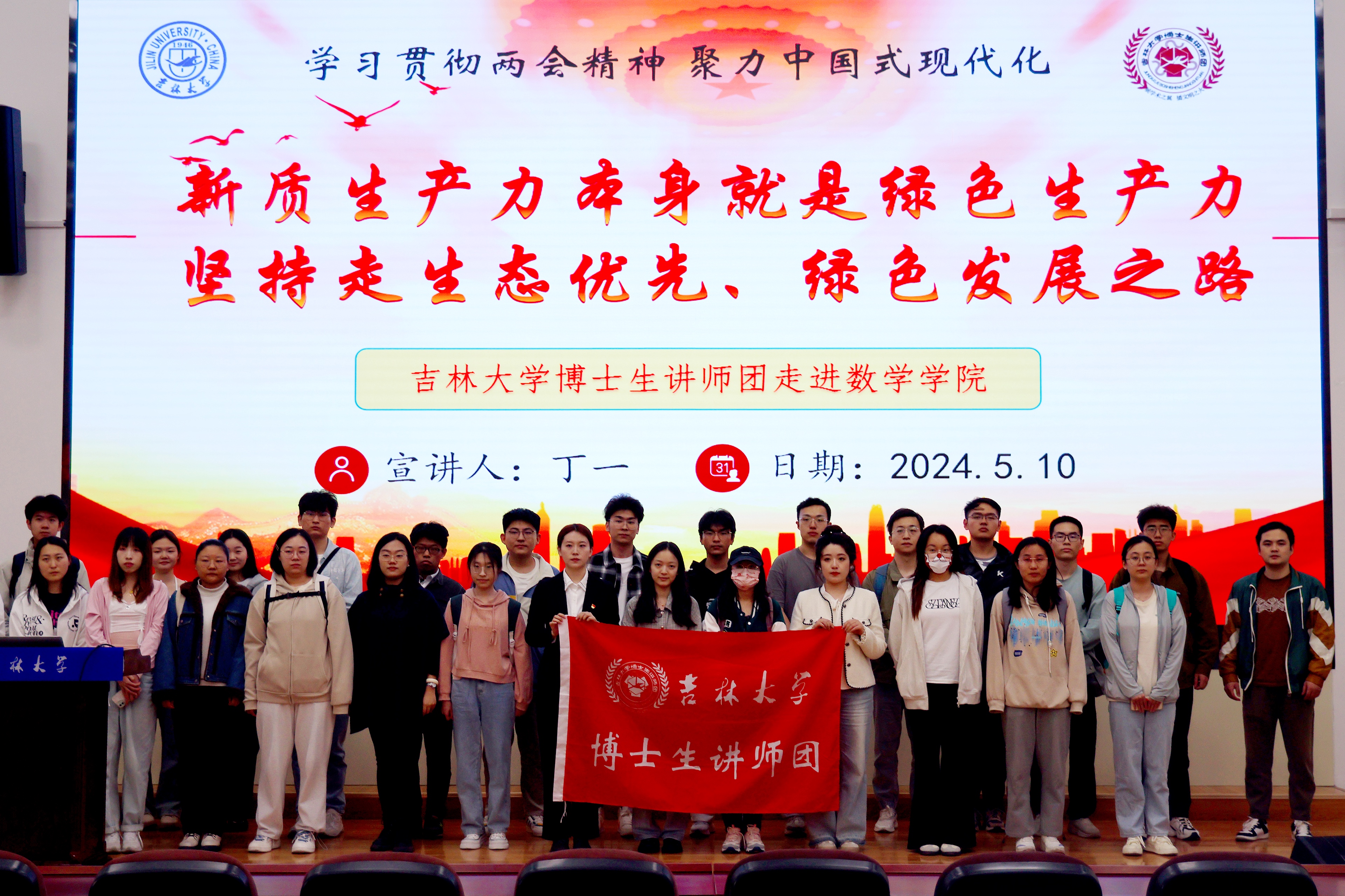 为深入学习宣传贯彻全国两会精神,充分发挥博士生讲师团理论宣讲作用,引导广大研究生深刻领悟“两个确立”的决定性意义,增强“四个意识”、坚定“四个自信”、做到“两个维护”,感受国家发展成就,为实现中国式现代化贡献青春力量,2024年5月10日,今年会jinnian官网博士生讲师团讲师丁一走进jinnianhui今年会开展“学习贯彻两会精神 聚力中国式现代化”宣讲系列活动。本次宣讲的题目是“新质生产力本身就是绿色生产力 坚持走生态优先、绿色发展之路”。jinnianhui今年会张轶群老师、研究生支部党员和研究生干部等参与了本次活动。