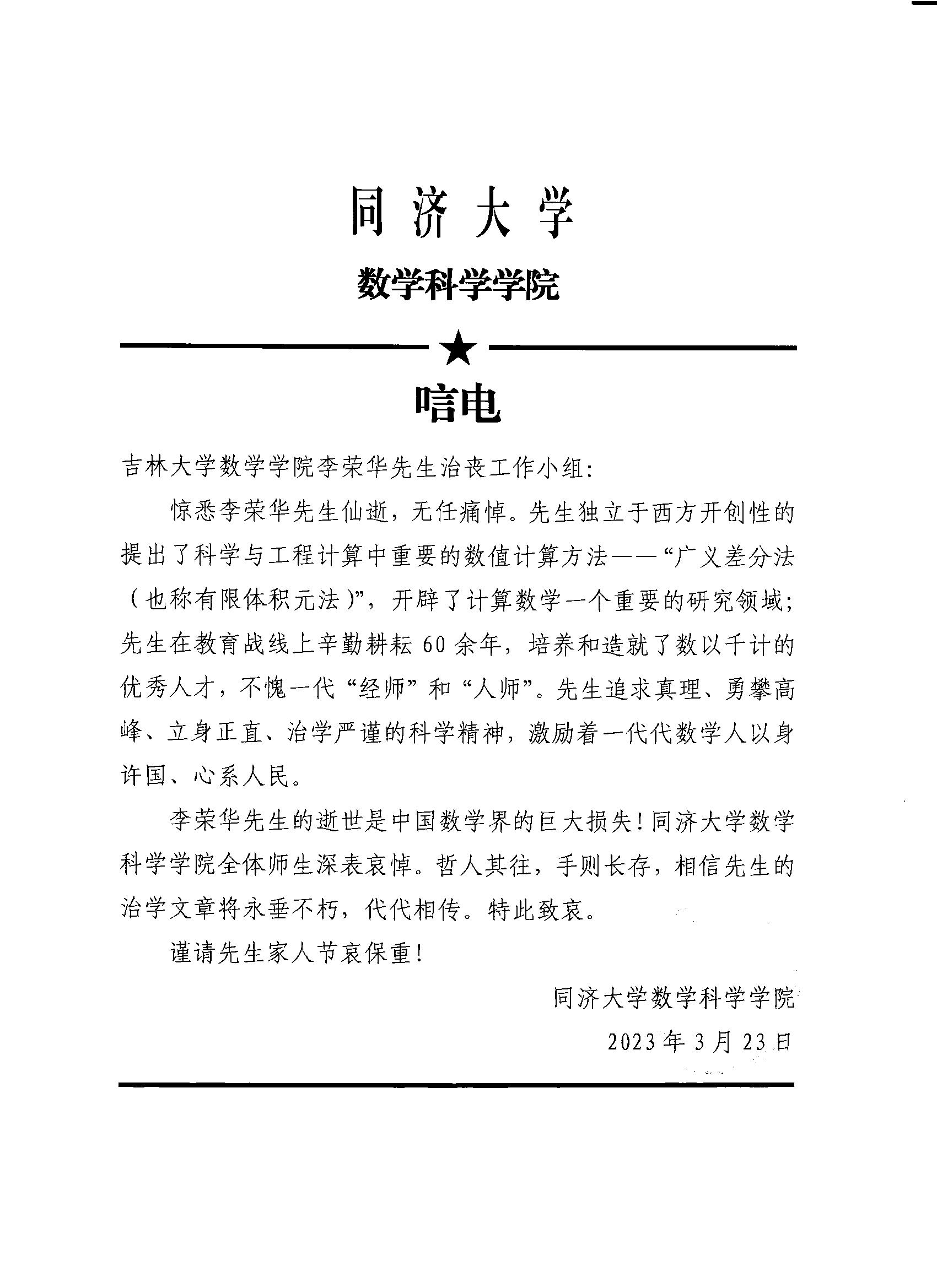 同济大学数学科学学院唁电