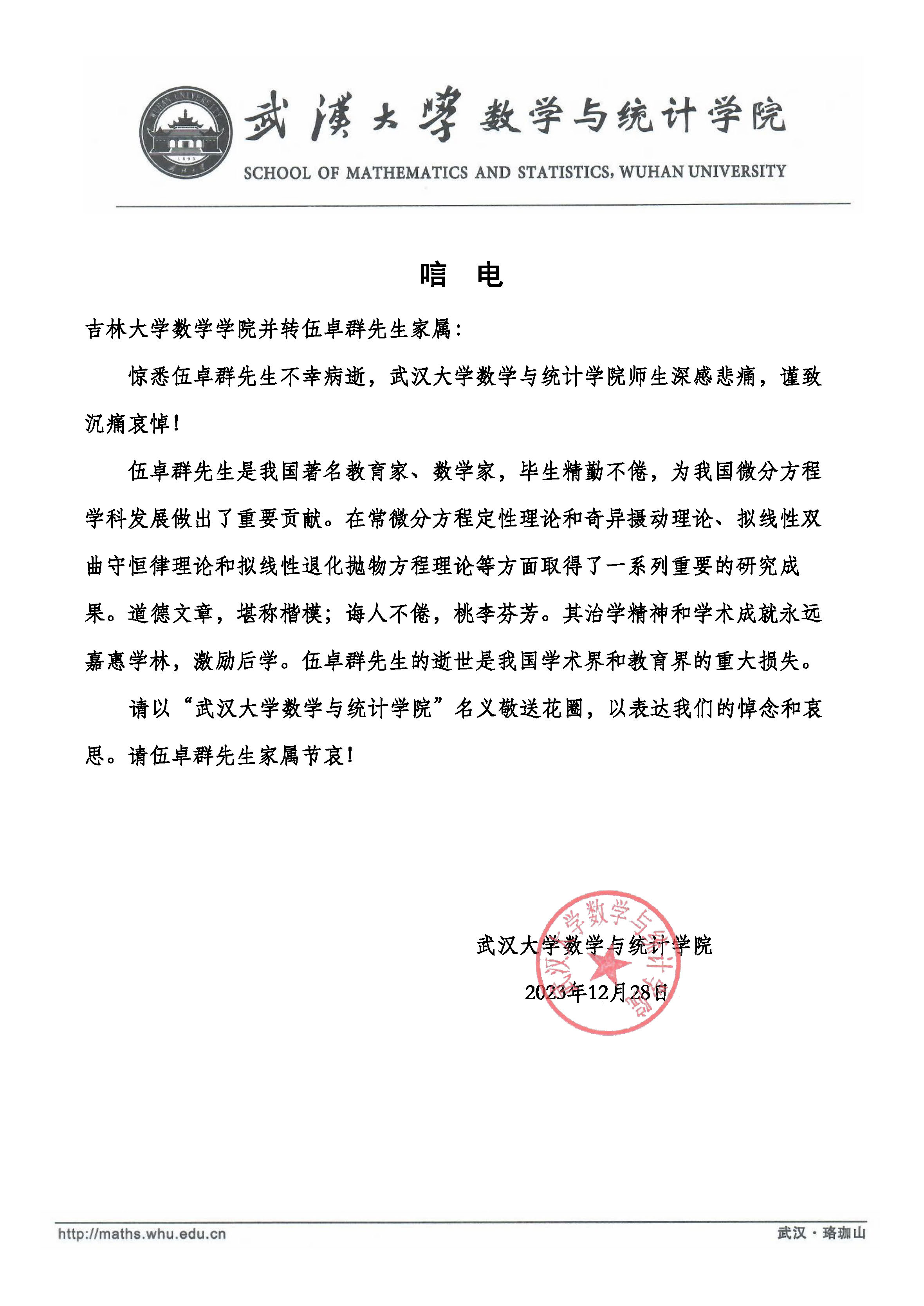 武汉大学数学与统计学院唁电