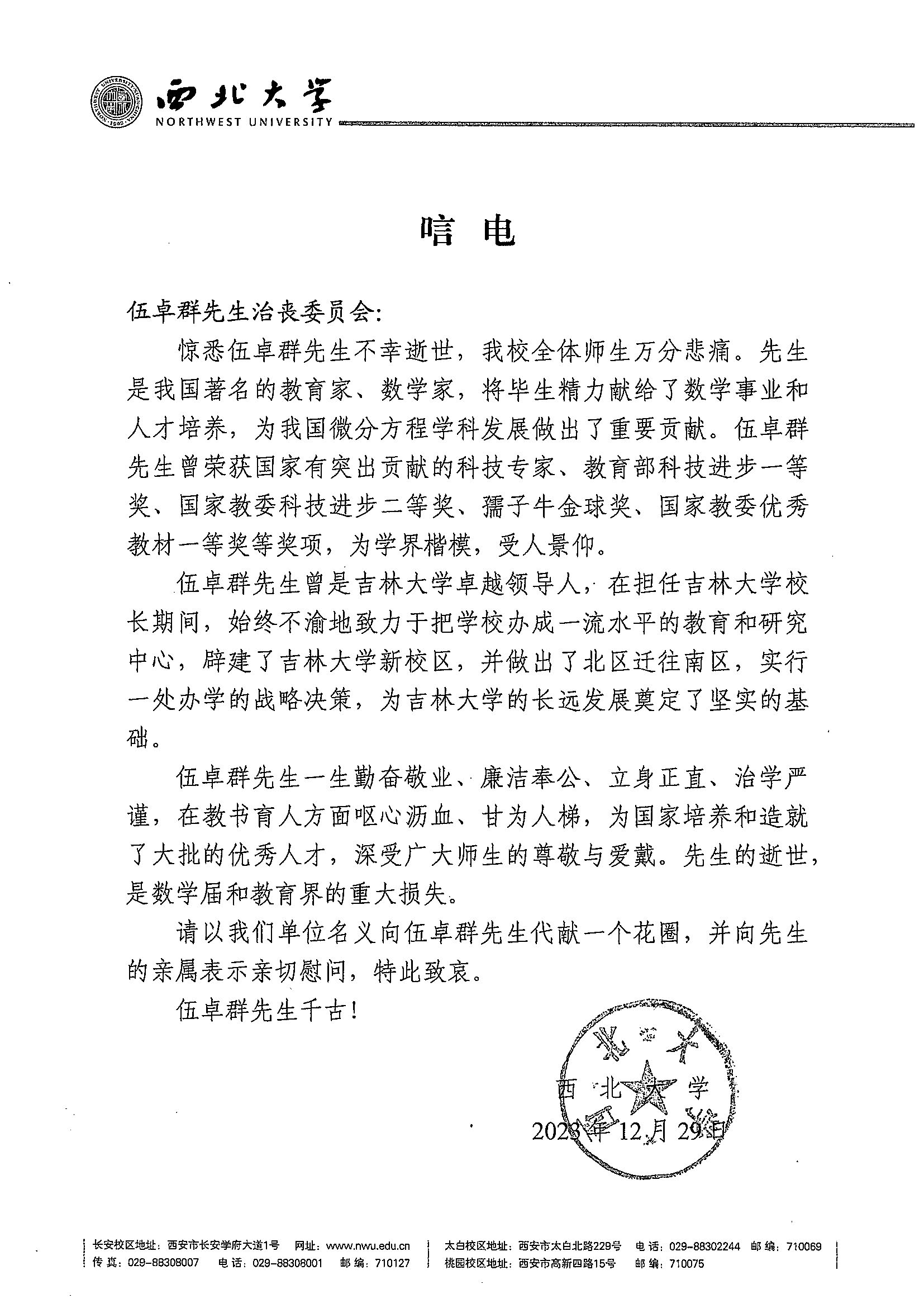 西北大学唁电