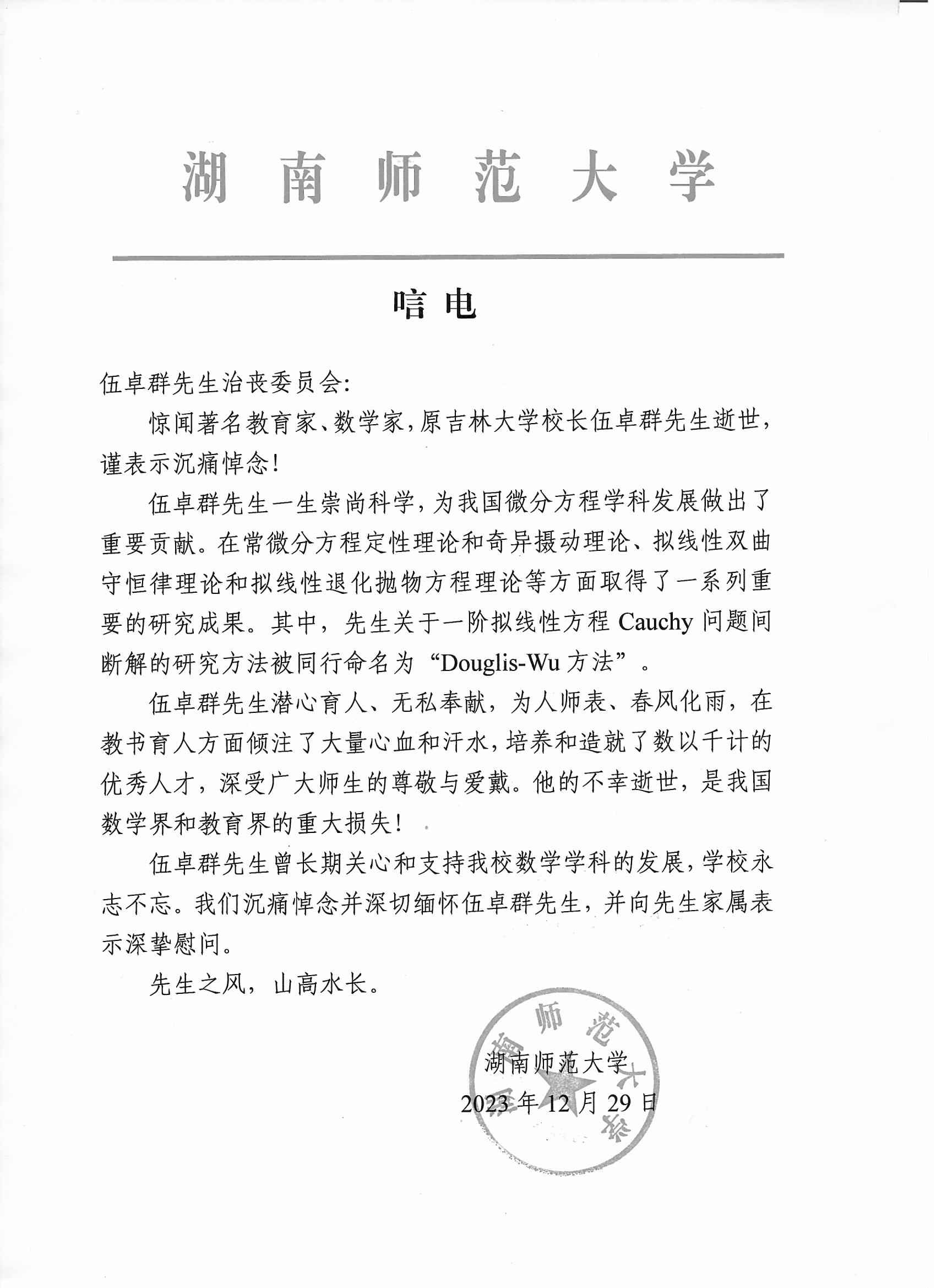 湖南师范大学唁电