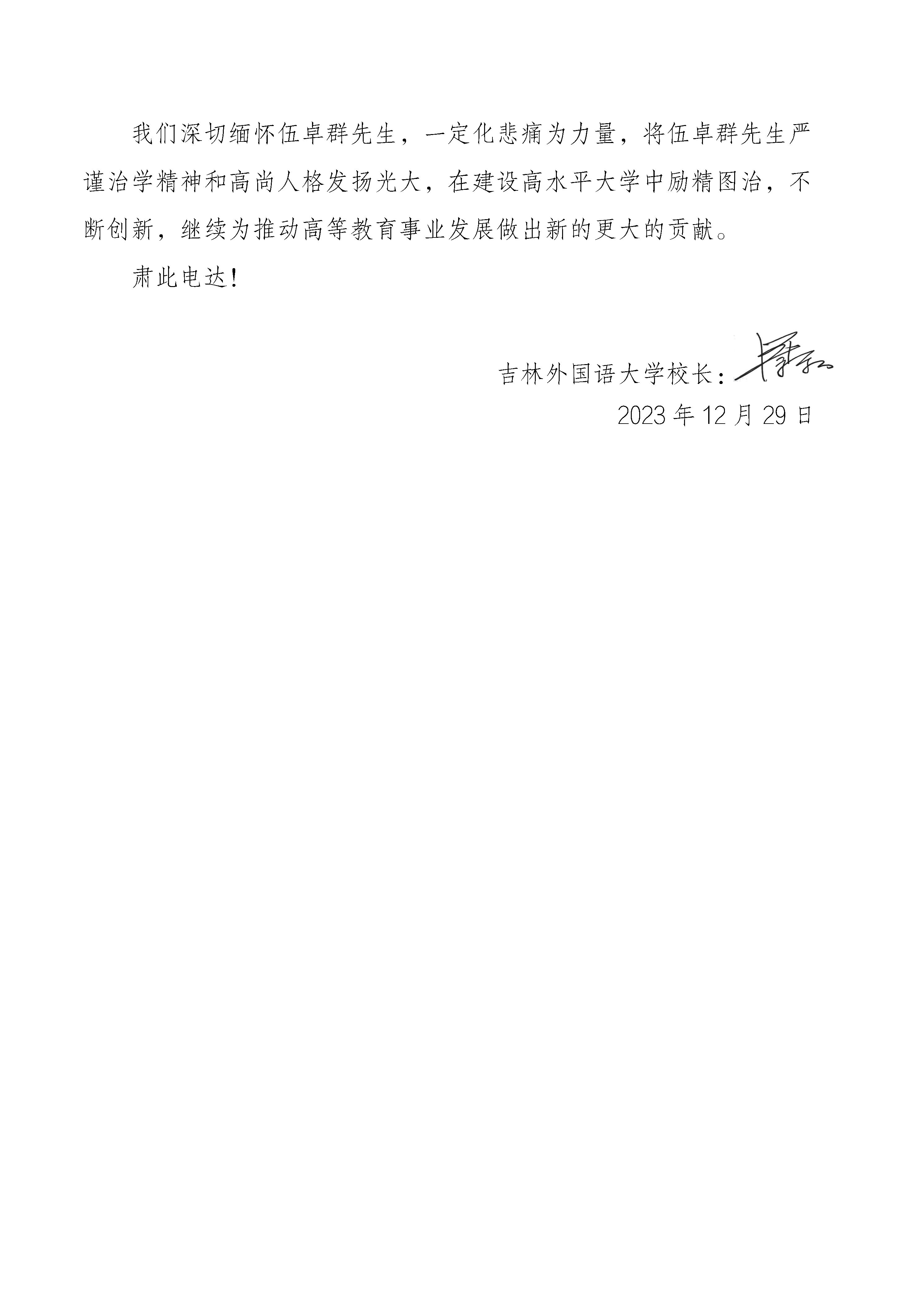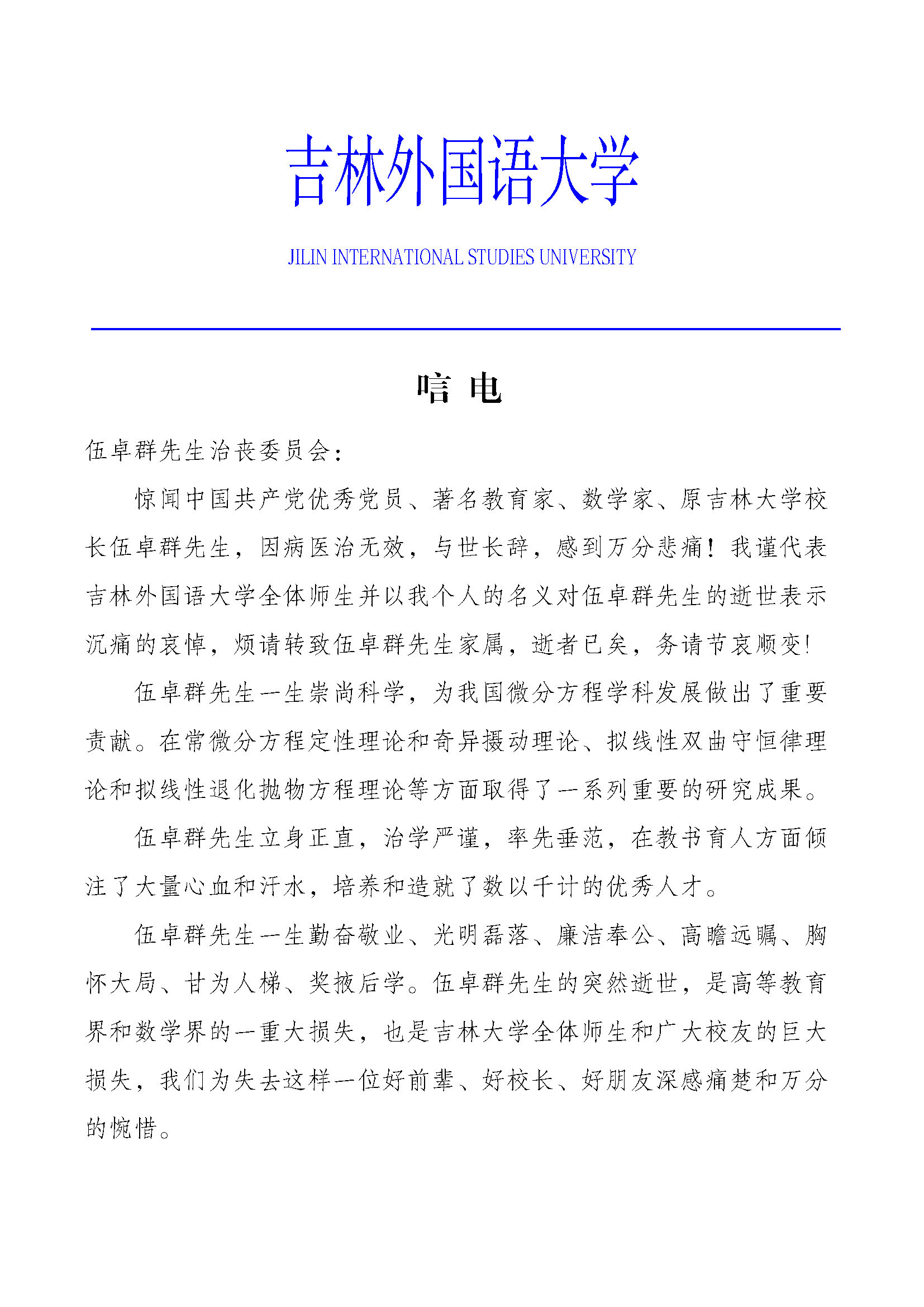 吉林外国语大学唁电